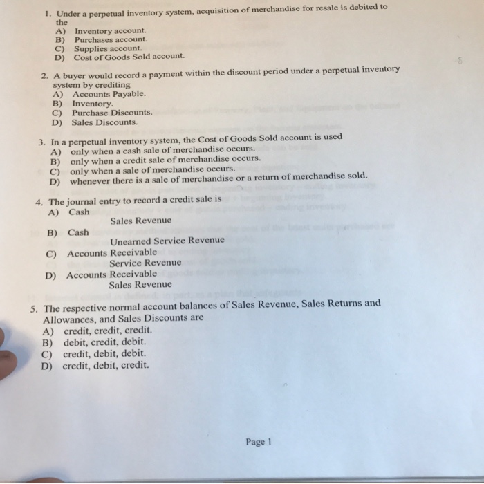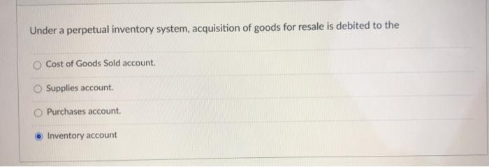 B the Purchases account. 4 Under a perpetual inventory system acquisition of merchandise for resale is debited to Entry field with correct answer the Cost of Goods Sold account. Under a perpetual inven tory system acquisition of merchandise for resale is debited to. The Cost of Goods Sold account. B the Purchases account. Under a perpetual inventory system acquisition of merchandise for resale is debited to. Under a perpetual inventory system acquisition of merchandise for resale is debited to the Inventory account.